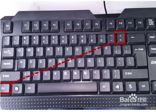 (2)下一步我们在键盘上,找到“ctrl”键和“+=”键。按住这两个键的组合即“ctrl+”,如图