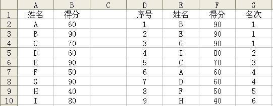 AB两列为姓名和得分,DEFG是对名次进行排序,步骤如下:
