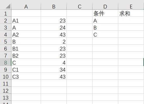 公式表示:将A列中以D2单元格开头条件的对应B列求和