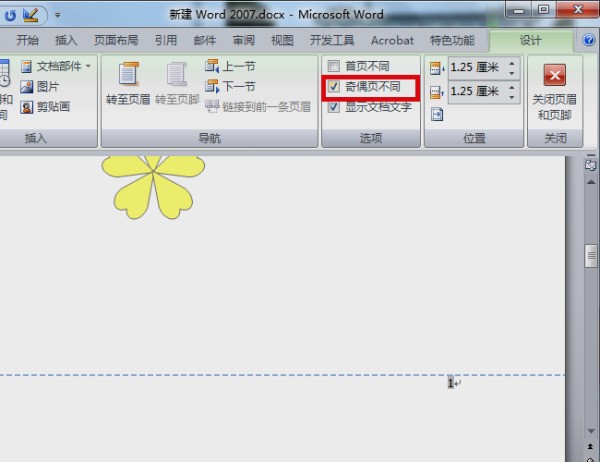 4、然后在“设计”的菜单页面下,勾选“奇偶页不同”选项。