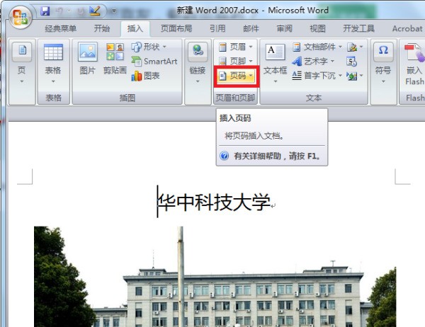 2、然后在“插入”的菜单下,点击“页码”选项。