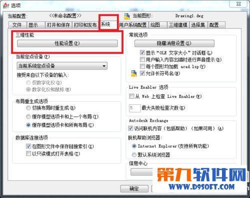 2、在选项窗口中,选择“系统”--“性能设置”,如下图所示: