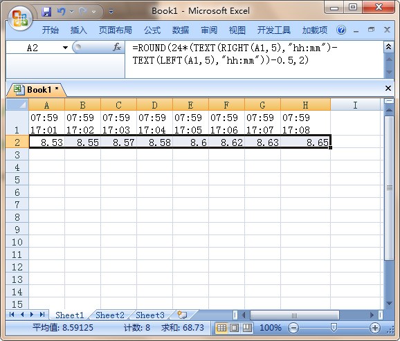 你算错了,07:59~17:01是9小时2分,再减去半小时是8小时32分,合8.53小时。
