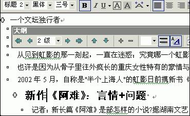 目录项的定义很简单,点击“视图”→“大纲”切换至大纲模式,如下图所示,大纲模式下文档各段落的级别显示得清楚,选定文章标题,将之定义为“1级”,接着依次选定需要设置为目录项的文字,将之逐一定义为“2级”。当然,若有必要,可继续定义“3级”目录项。