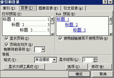一共只定义了二个级别的目录项,因此将上图“显示级别”中的数字改为“2”。“显示页码”与“页码右对齐”这二项推荐选择,前者的作用是自动显示目录项所在的页面,后者的作用是为了显示美观。“制表符前导符”即目录项与右对齐的页码之间区域的显示符号,可下拉选择;此外,有多种目录显示格式可供选择,下拉“格式”就可以看到了。