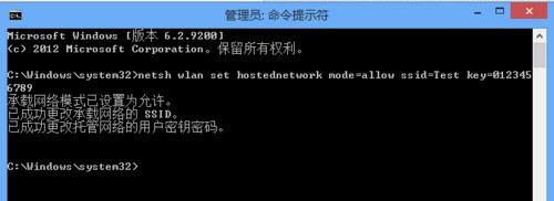 点击后,系统就以管理员权限打开了命令提示符,在命令提示符中输入以下命令“netsh wlan set hostednetwork mode=allow ssid=Test key=0123456789”(不包括双引号,下同),回车,如下图所示: