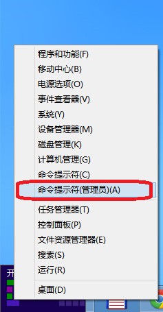 首先将鼠标移到桌面左下角,单击右键,在弹出的快捷菜单中找到“命令提示符(管理员)”,点击,如下图所示: