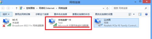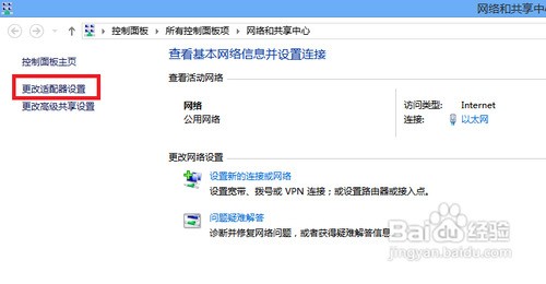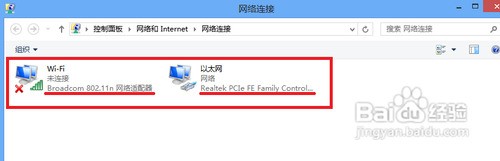 打开后,在窗口的左上,找到“更改适配器设置”,在打开的网络连接窗口中,我们并未找到win7下所出现的虚拟的无线网络连接,如下图所示,这是因为win8下,即使已允许网络承载模式仍然需要先启动,才能找到,这也是为什么很多用户找不到虚拟出的网络的原因;