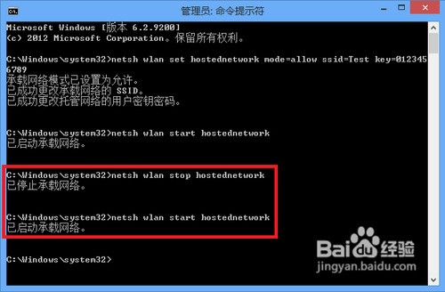 在最后一步操作完毕后,建议大家再命令提示符中,先关闭承载网络,再启动承载网络,相当于重启一次,如下图所示:
