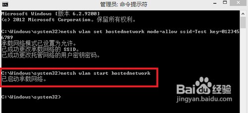 回到命令提示符窗口,输入命令“netsh wlan start hostednetwork”,回车,启动承载网络,如下图所示: