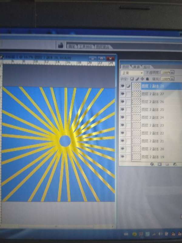 复制一层(ctrl+j),再ctrl+t(变换选区)把中心点按alt拖到画布中心,如下图
