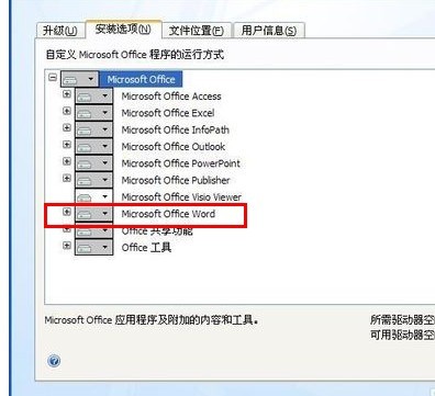 5、设置“安装选项” 在安装向导中,切换到“安装选项”,office软件含有Acccess、Excel、InfoPath、Outlook、PowerPoint、Pubisher、Visio viewer、Word Offcie共享功能、Office工具这些组件。有的软件不需要用的,可以点击组件旁边的小三角符号选择“不安装”。