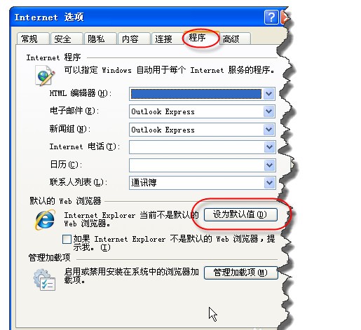 3.在“选项”窗口中,在“程序”选项卡,点击下方的“设为默认值”