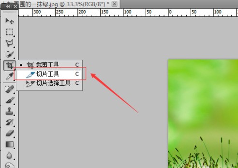 1.打开一张需要切片的图片,然后选择左侧的工具栏中的切片工具,如下图所示: