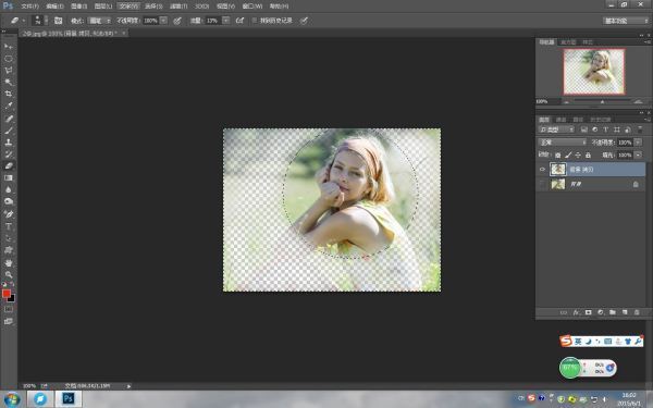 2)用椭圆形选框工具圈定人物,羽化20像素,反选,用橡皮擦擦除周围部分;