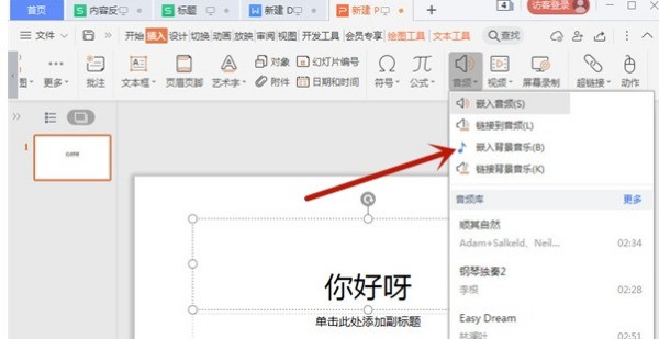然后一路点:插入→影片和声音→文件中的声音,弹出窗口后找到你刚下的那首歌,选中它,开整!