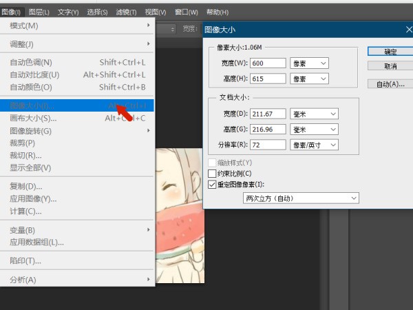 4、如果需要改变图像本身的大小可以单击菜单栏中的图像菜单,并设置图像大小,在弹出的图像大小窗口中设置宽度和高度即可。