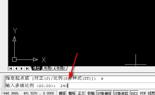 3.确认墙线命令ML后,输入墙线比例S,然后按回车键确定,如下图。