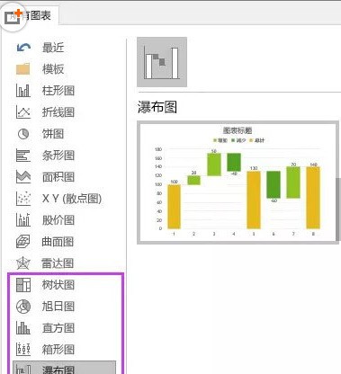在 PowerPoint 2016,已经添加了六个新的图表,可帮助创建一些最常用的数据可视化的财务或层次结构的信息; 展示统计数据中的属性。新增图表如下图,特别适合于数据可视化