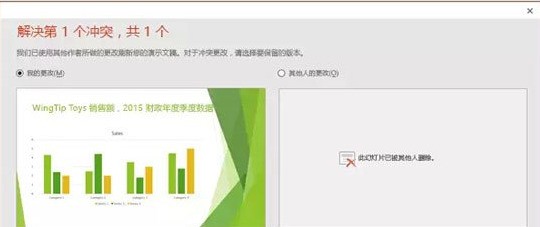 现在,当演示文稿正与他人协作,而所做的更改与其他用户所做的更改之间发生冲突时, 可以看到相互冲突的更改幻灯片的并排比较,可以轻松选择你想要保留的版本。