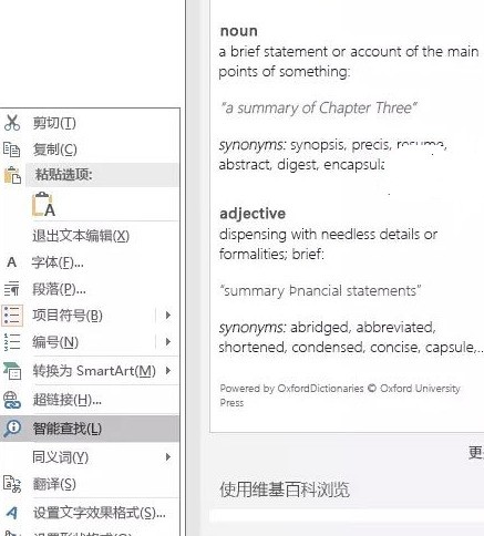 当选择某个字词或短语、 右键单击它,并选择智能查找,窗格将打开定义,定义来源于维基百科和网络相关搜索。