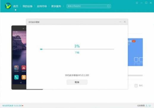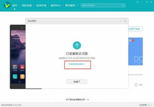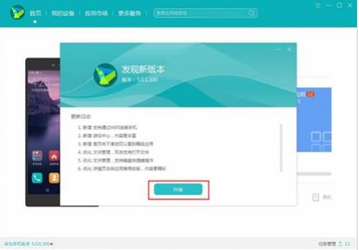 3. 看左下角那个红点(图里红框标了),点进去再点升级,把华为手机助手更新到最新版5.0.3.300,这步很重要别跳过!