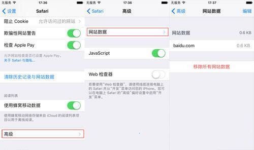 (2)还可以进入“设置”——“Safari”——“高级”——“网站数据”——“移除所有网站数据”。