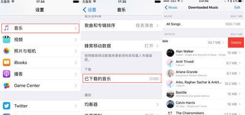 进入“设置”——“音乐”——“已下载音乐”可以看到下载过的歌曲和专辑。向左滑动就可以点击“ 删除 ”。