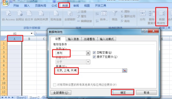 4、选中a1:a10单元格,选择“数据—有效性”,进行如图所示设置即可,其中来源中输入=省份