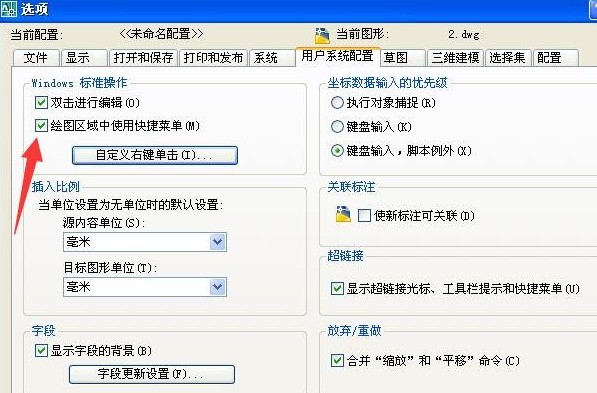 3、接着,打开“金用户系统配置”菜单后,勾选“绘图区域中使用快捷菜单”功能,然后按Enter键保存设置,如下图所示。