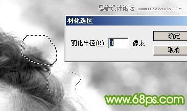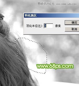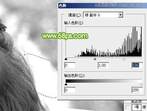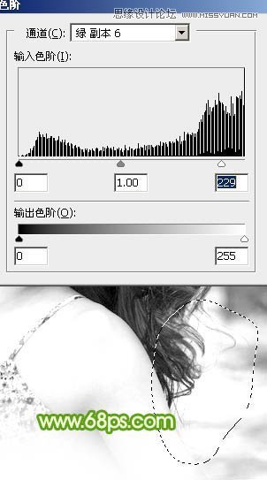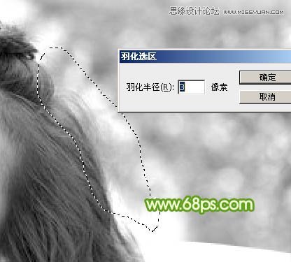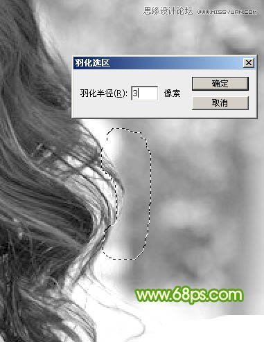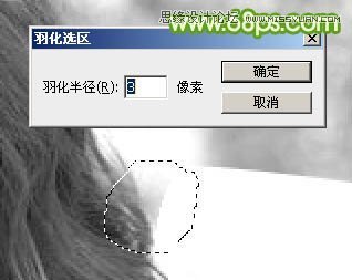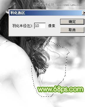 5、初步调亮后头发的明暗部分非常明显了。现在由右侧底部开始分段来处理。先用套索工具选区图8所示的选区,羽化10个像素后按Ctrl + L 调亮,如图9。调亮的标准就是不要丢失细节,细节开始丢失的时候就停止调亮,如图9中局部还有灰色的区域。