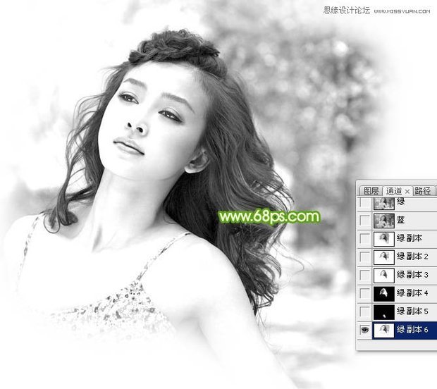 2、把绿色通道复制一份,得到绿副本通道,把发丝部分稍微放大一点,顶部区域的发丝与背景比较接近,比较难处理,如下图。