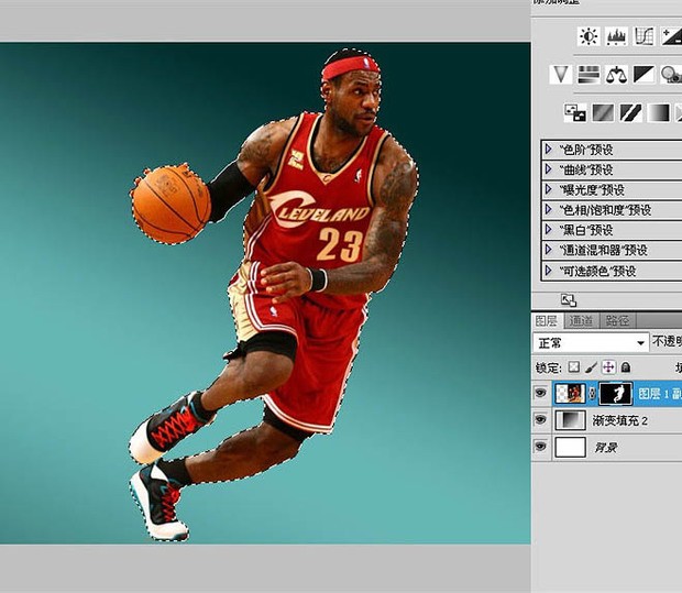 二、新建一个渐变调整层,渐变的颜色我随心所欲,而后再慢慢改变球员队服的颜色,原图中的背景跟队服颜色似乎是相映衬。