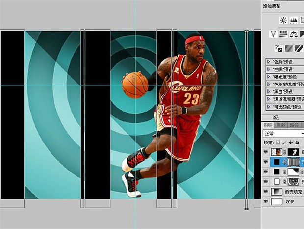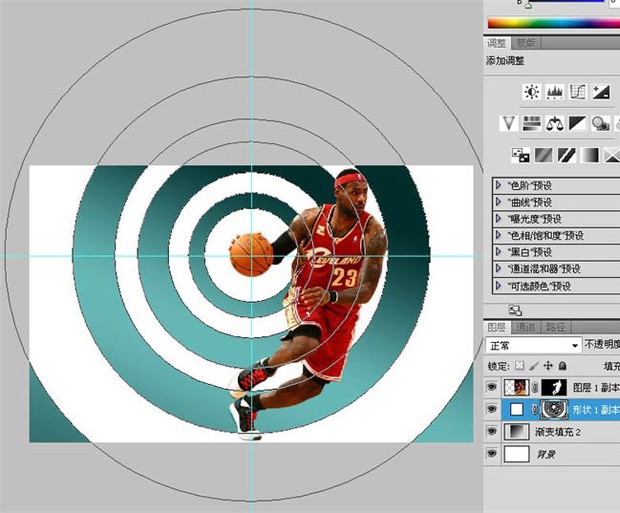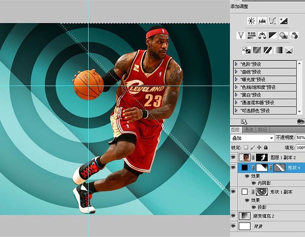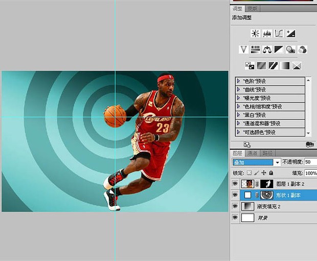 六、以篮球为中心布置两条参考线,因为背景中的圆环都是以篮球为中心的同心圆。我经常看到有人问怎么布置参考线,这个问题让你我都很纠结,回答起来当然很简单,问题是你现在被参考线难倒,后面有比参考线更复杂的东西,你怎么继续下去?