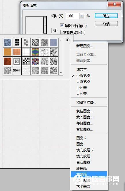二、再次点击“图层””>新建填充图层>图案,在弹出的对话框中点击下拉菜单,点击右边箭头,然后选择灰度纸,选择纤维纸1。缩放可以扩展到340%(原文是这么写的,但是我这张图不大,所以只扩展到了260%),并单击确定。设置此层混合模式为柔光,不透明度35%。
