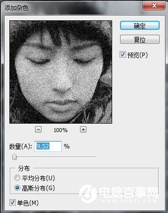 六、我们需要增加一些杂色来模拟纸张的效果,所以点击菜单 “滤镜-杂色-添加杂色”。使用12%的数额(这个是作者的数值,具体还得看情况),选择高斯分布,单色。如做她酸图。