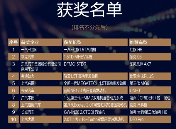 中国心十佳发动机跟沃德十佳、国际年度发动机并称全球三大发动机评选,含金量直接拉满。2020年这一届照样热闹,自主和合资品牌一起卷,海选近50款发动机,最后15款进实测,最终挑出10个中国心年度十佳。上榜的几乎全是主流大厂:一汽红旗、领克、东风、比亚迪弗迪动力、名爵、长安、长城、上汽大通、广汽本田、上汽通用全在列。