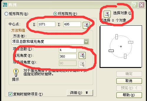 ,然后你要围绕哪个中心点阵列就点选那个点。3、方法,下拉菜单里有各种排列的计算方法,但是不论选择哪一种,都要在下面的项目总数、填充角度或者项目间的角度里面填上你所需要的值。这个时候右下角的预览和确定按钮就可以选择了。