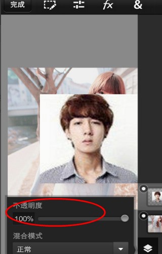 5、改变不透明度的值,可以通过第二张图片变得透明起来,可以模糊的看到第一张图片了。这里注意操作是在第二张图片的图层里进行的。