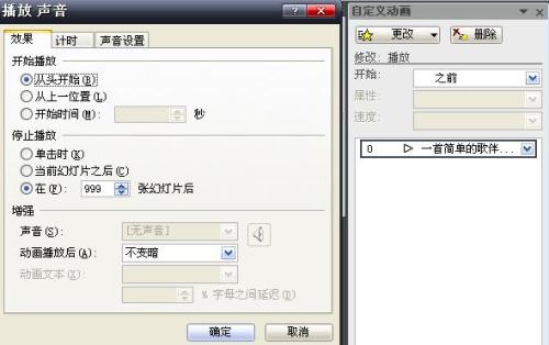 选择声音图标,再单击“幻灯片放映/自定义动画”,在幻灯片右侧出现“自定义动画”窗格,窗格下方列出了该幻灯片中的全部对象,选择刚插入的声音对象,在右键菜单中选择“效果选项…”,出现“播放声音属材安室造价试承育半合”对话框,在“停止播放”选项中选择第三个选项,然后在方框内填入需要停止声音的幻灯片的序号,单击“确定”。这样你的音乐就可以在张幻灯片中连续播放了