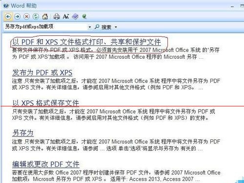 02在搜索框中输入“安装和使用microsoft另存为pdf或xps加载项”,得出搜索结果后点击第一项。