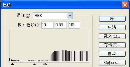 5、为了使效果更加明显,在原来的基础上再执行一次色阶命令,这次将输入色阶参数设置为:10;0.55;115,完成后按【好】按钮,提示:使用色阶命令可以有效的实现图像的色域分离,这就是一个很好的例子