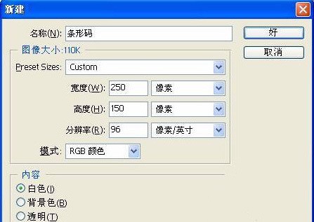 1、首先我们执行【文件】菜单中的【新建…】命令,或按快捷键Ctrl+N,打开【新建】对话框,输入图像的“名称”为“条形码”