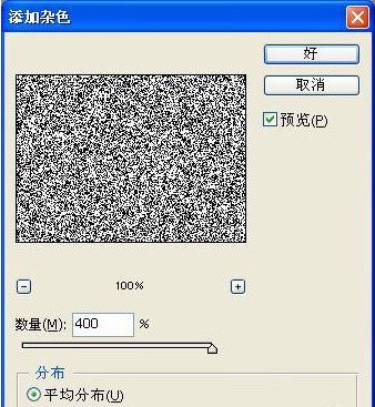 2、执行【滤镜】|【杂色】|【添加杂色…】命令打开【添加杂色】滤镜对话框,设置“数量”为400%;“分布”为“平均分布”;勾选【单色】多选框,完成后按【好】按钮,这样就为图像添加了杂点底纹