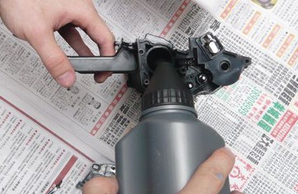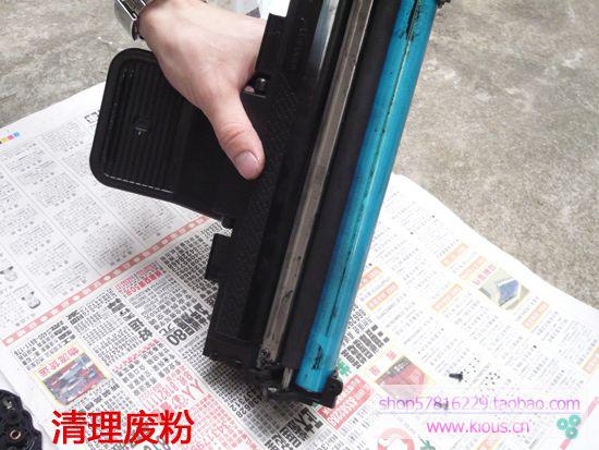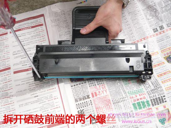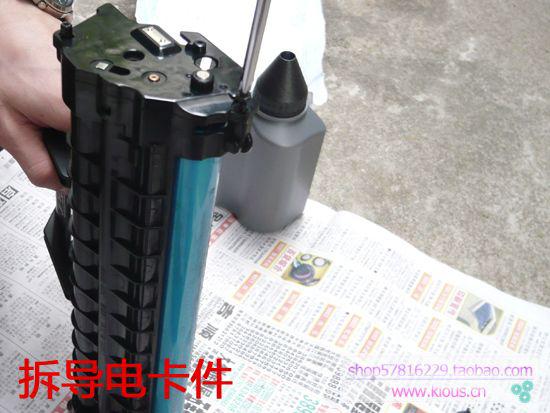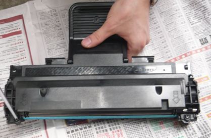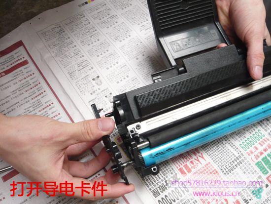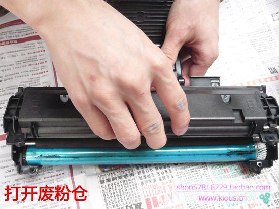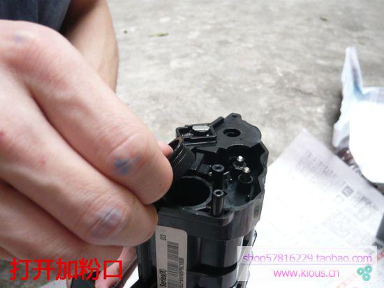 3、在取下来时可以看到一个圆形塑料盖,用手慢慢撬开,然后向里面加入碳粉。