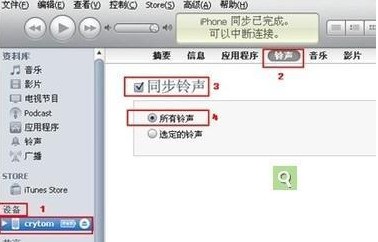 10.然后在“设备”里打开“iphone”选择“铃声”,在“同步铃声”项打钩,选择“所有铃声”,或者“选定铃声”,然后选择“同步”,即可。