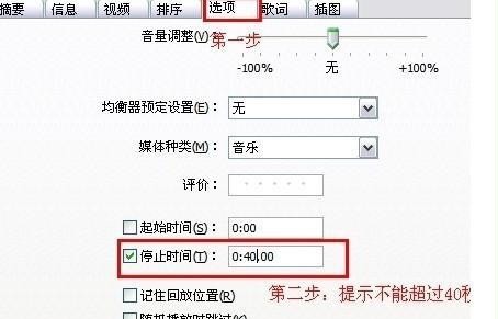 4.选择“选项”填上“起始时间”和“停止时间”(在40秒以内),-“确定”。