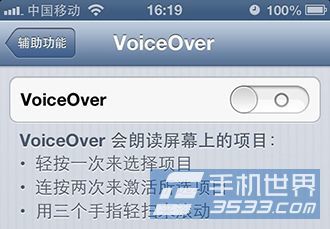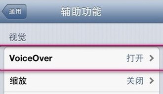 3)然后在“辅助功能”中轻按一次来选中的“voiceover”,再按二次进入开关切换选项(如下图所示)