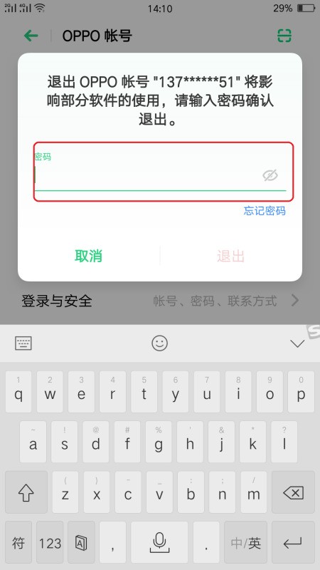 四、进入以后输入密码验证,验证通过以后即可退出当前OPPO帐号。