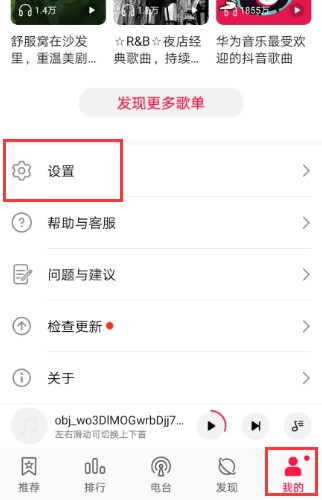 一、第一种情况,打开华为音乐“我的”界面,点击打开“设置”。